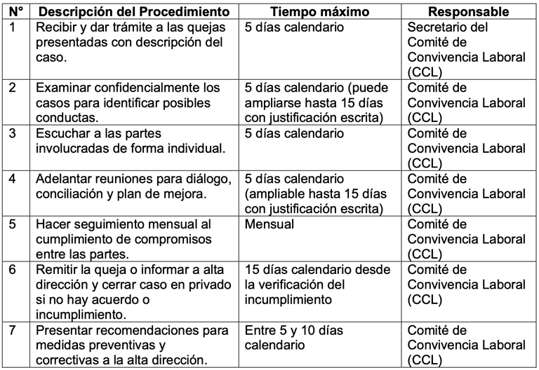A continuación, se presenta el procedimiento para tramitar quejas por acoso laboral de conformidad a lo establecido en la Resolución 3461 de 2025, regido bajo el derecho al debido proceso y los principios de celeridad, eficacia, imparcialidad y confidencialidad. Se aclara que el presente proceso se encuentra establecido en el documento SST-P Procedimiento para tramitar la gestión de quejas al comité de convivencia laboral: